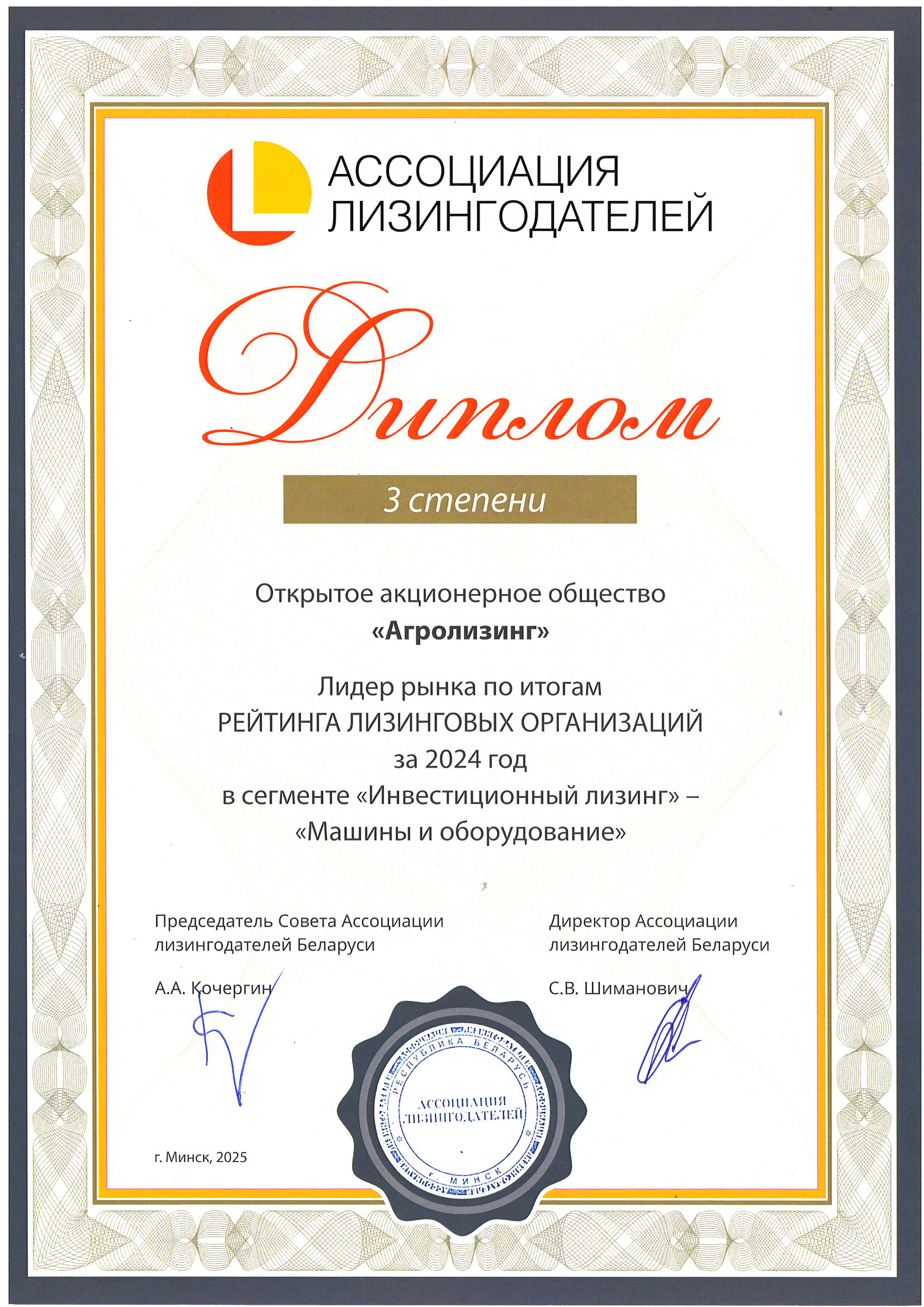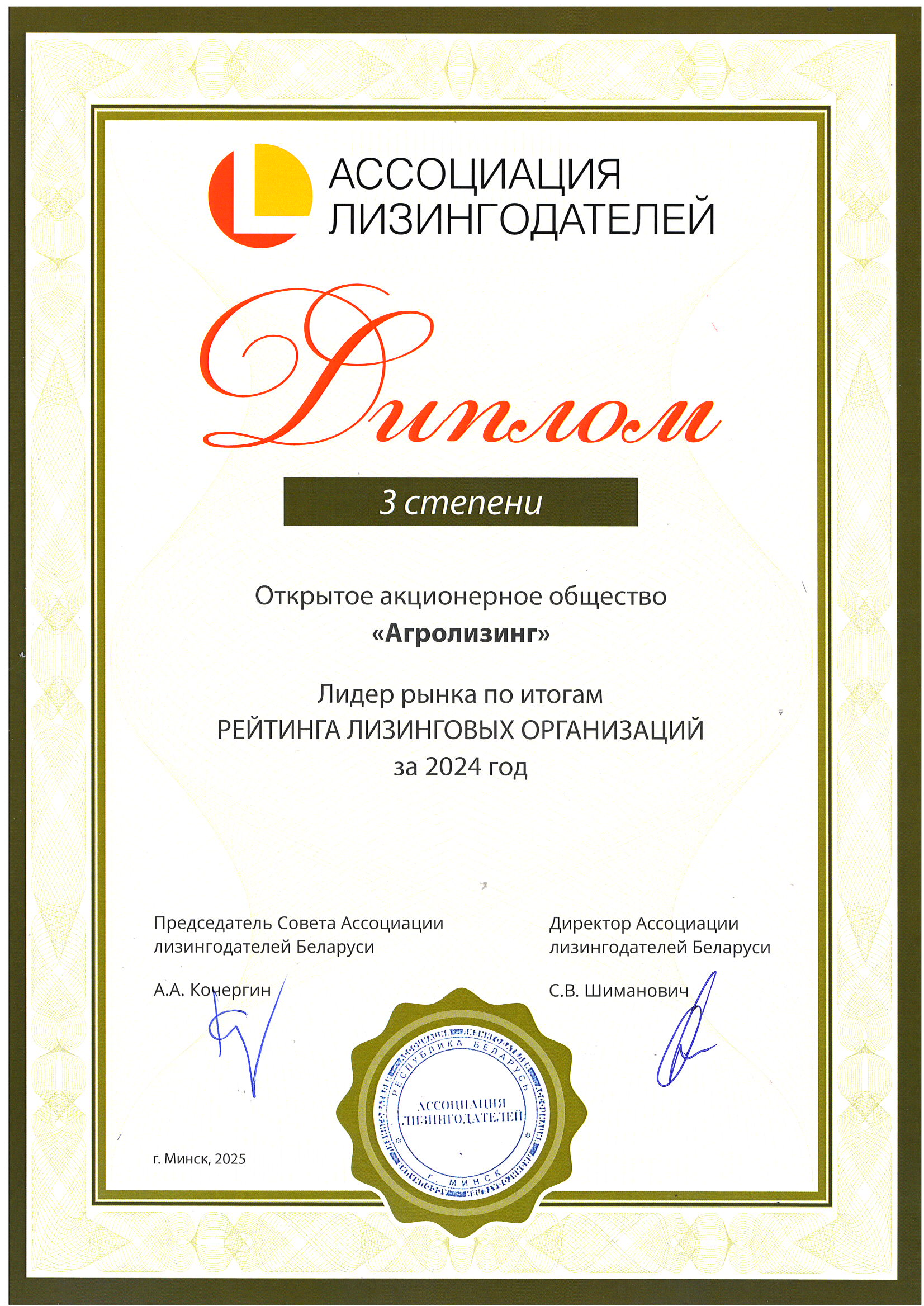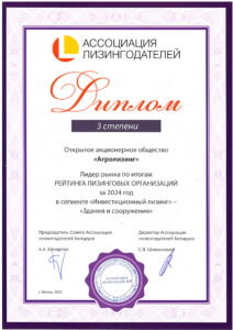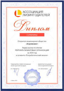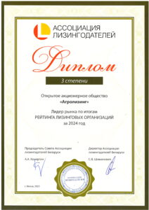 По итогам работы за 2024 год ОАО «Агролизинг» заняло общее 3 место в рейтинге лизинговых организаций Республики Беларусь.
